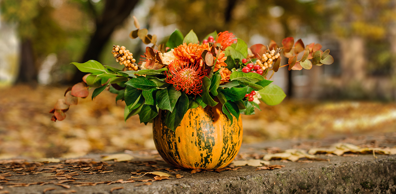 Самостоятельно создать такой букет по силам любому. Просто сходите в парк или огород и соберите цветы, ягоды и листья разных оттенков — красных, желтых или зеленых. Также прихватите с собой веточки разной длины.